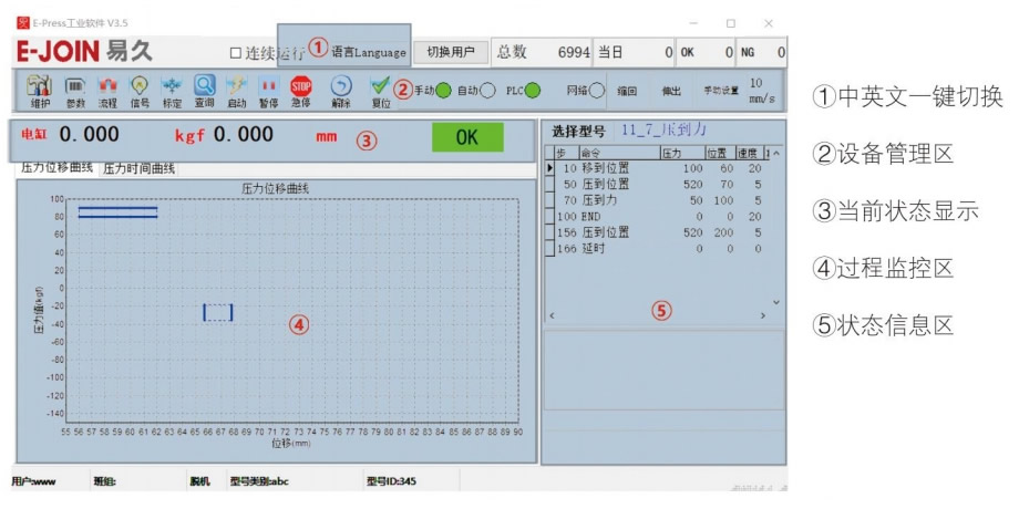 數(shù)據(jù)采集頻率20KHZ,采集精度24bit,可存儲500萬條以上壓裝曲線,E-press 工業(yè)軟件支持二次開發(fā)。